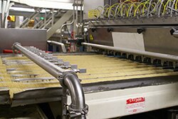 Les cellules photoélectriques hygiéniques sont placées devant la machine de conditionnement à l’usine de Malines où est fabriqué le produit pour le marché européen et la Russie. Vous connaissez certainement ces chips de couleur, de forme et de taille parfaitement uniformes, conditionnées dans des tubes en carton. Cette uniformité vient du fait que les chips ne sont pas fabriquées à partir de fines rondelles de pommes de terre mais qu’elles sont mises en forme une par une. « Nous partons d’une farine de pomme de terre » explique Philippe Bossaert, un des team leaders de l’équipe responsable de l’électricité et de l’automatisation. « La pâte est laminée en début de ligne et des rondelles de forme elliptique y sont découpées. Ces chips sont ensuite cuites sur une forme dans de l’huile, ce qui leur donne cette apparence caractéristique de selle de cheval.»