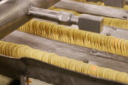 La production est un processus continu et chaque ligne dispose de 12 pistes parallèles sur lesquelles les chips sont successivement découpées, cuites et assaisonnées. Le défi suivant consiste à empiler les chips dans les tubes en carton. Une machine de conditionnement spécifique a été construite à cet effet et placée en fin de chaque ligne.