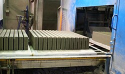 De basis voor al deze producten is aardvochtig beton dat onder hoge druk en met een bepaalde trilfrequentie in mallen geperst wordt. “Elke cyclus duurt 10 tot 15 seconden en levert per cyclus ongeveer een vierkante meter product op”, legt plant manager Marc Paredis uit. “Na het persen worden de producten meteen ontkist (uit de persvorm geduwd) en gaan ze via een transportbaan naar de droogkamers waar ze dan een 20 tal uren moeten uitharden.