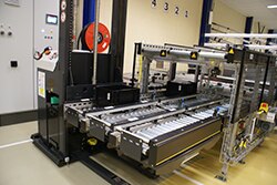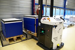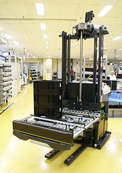 Voor het transport van bakjes met componenten werden speciale AGV’s ontwikkeld met daarop een platform met rollenbaantjes dat naadloos kan aansluiten op de rollenbanen die uit het magazijn komen en op de flowracks aan de productielijnen.