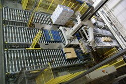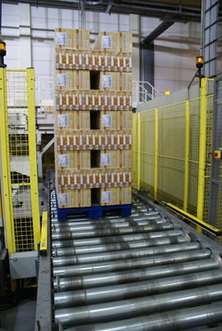 Zodra een pallet vol is, gaat die over een rollenbaan naar een transferwagen die ze naar een van de twee beschikbare wikkelmachines brengt. Het concept is bijzonder efficiënt en maakt maximaal gebruik van de beschikbare apparatuur.
