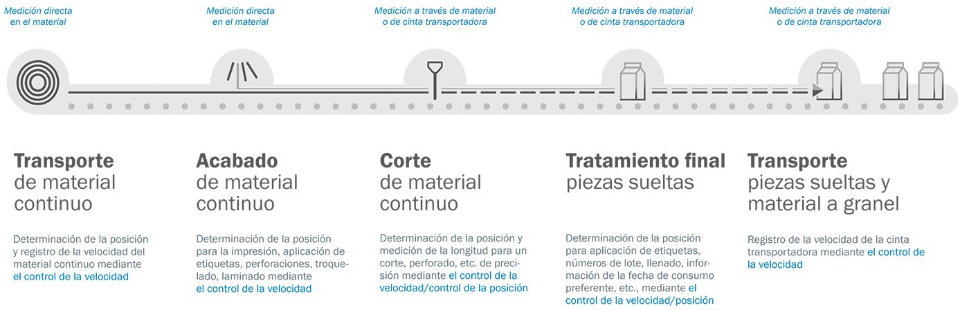 En numerosas aplicaciones industriales se requiere información sobre la velocidad o la longitud para el procesado de, por ejemplo, bandas textiles, folios de papel, embalajes o material continuo. Los sensores Surface Motion de SICK representan una variada gama de soluciones que detectan con precisión los movimientos de las superficies de los objetos sin una medida materializada. Que las superficies sean duras, blandas o porosas carece de importancia. Los encoders de rueda de medición y el sensor de movimiento sin contacto SPEETEC proporcionan datos fiables para la producción acerca de la velocidad, la longitud, la posición o la dirección del movimiento. Una amplia gama de encoders de rueda de medición de ajuste flexible registran los movimientos sin deslizamiento y de forma especialmente cuidadosa con el material. SPEETEC funciona sin contacto y está por tanto especialmente indicado para materiales muy sensibles y muy blandos que habitualmente resultan difíciles de medir. Tampoco necesita contar con un punto de referencia. Como empresa orientada al cliente, SICK aporta muchos años de desarrollo y experiencia práctica, tanto en el campo de los sistemas de ruedas de medición como en la tecnología de sensores basados en láser, combinando la tecnología de medición tradicional con las tecnologías más avanzadas. La ventaja: la amplia cartera de productos ofrece la solución adecuada para cada nivel de rendimiento (PL) y para casi cualquier aplicación. Esto permite equipar las más diversas instalaciones con sensores y operarlas de forma rentable a largo plazo. Así se facilita la modernización de los procesos de producción, se ayuda a aumentar la eficiencia y se obtienen instalaciones preparadas para el futuro de forma sostenible.