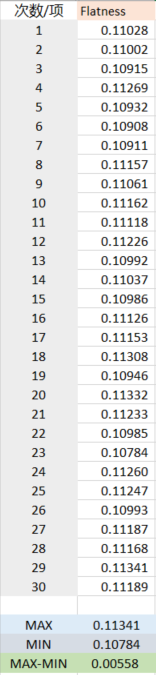 测试结果:通过运动机构往返30次,得到30次样品图像分析结果,得出单点(40个点)的重复性约为0.01mm,在平面度重复性数据在约为0.006mm。