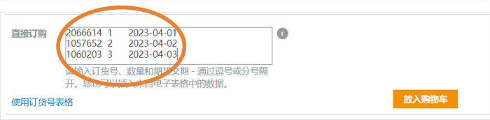4、批量下单-如您已有下单明细,可在“直接订购”导入批量产品信息快速下单,点击“放入购物车”即可。格式如下示例:(请留意日期格式必须是:yyyy-mm-dd或dd.mm.yyyy )