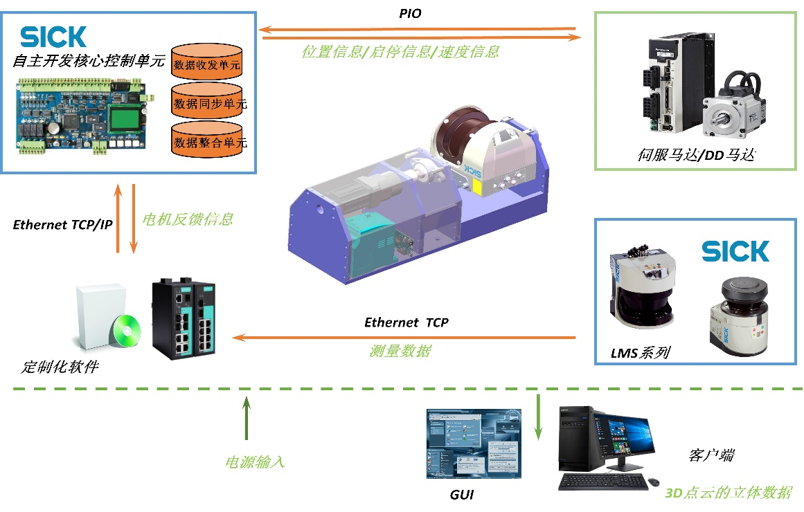 系统基于SICK 时间飞行原理的激光扫描器LMS系列产品,配合自主研发的自动旋转机构平台和数据处理软件,组合成为完整的一体化3D点云扫描解决方案,让单层二维画面变成三维立体,解决实际生产中存在的条件限制问题。在大型场外矿堆、煤堆的体积测量及轮廓扫描、港口集装箱识别/测量、钢卷自动定位抓取等领域有着开创性的应用。