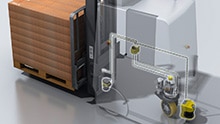 Safe AGV Forklift ist die effiziente Sicherheitslösung für fahrerlose Transportfahrzeuge (AGV) mit Hubgabel. Die Installation auf automatischen Hubgabel-Fahrzeugen mit einem Antriebsrad ist einfach. Die geschwindigkeits- und richtungsabhängige Schutzfeldumschaltung der Sicherheits-Laserscanner vermeidet Stopps und schont Verschleißteile. Bisherige Lösungen verhindern automatisches und normgerechtes Be- und Entladen, weil das Schutzfeld des Laserscanners durch die Hubgabel verletzt wird. Durch den Einsatz von Sicherheits-Encodern kann das Fahrzeug bei abgesenkter Hubgabel mit sicher reduzierter Geschwindigkeit weiter bewegt werden. Dies steigert die Produktivität und ermöglicht den vollautomatischen und sicheren Betrieb von AGVs mit Hubgabel.