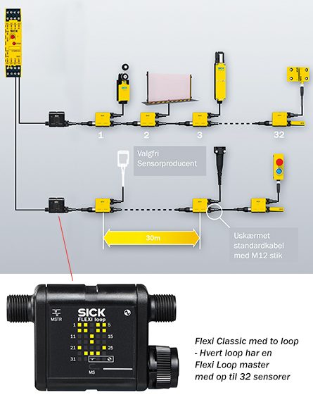 Sammen med Flexi Loop, der er en sikker kaskadekobling af op til 32 sikkerhedskomponenter, kan Flexi Classic sikkerhedsmoduler sikre selv store applikationer på en kosteffektiv og en simpel måde. Bindeleddet mellem sikkerhedssystemet og sikkerhedskomponenterne er Flexi Loop Masteren, der håndterer kommunikationen på kaskadekoblingen. Derudover er der på master enheden også mulighed for visualisering af status på loop-strengen via 32 LED. Ønskes en mere detaljeret information kan Flexi Loop Masteren også leveres med interfacet, IO-Link.
