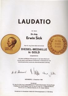 On December 2, Erwin Sick receives the gold Diesel Medal for his numerous inventions in the field of opto-electronics.