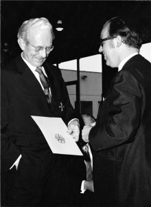 Erwin Sick is presented with the Bundesverdienstkreuz 1. Klasse (Order of the Federal Republic of Germany, Ist Class) by Justice Minister Rudolf Schieler on November 26 to commemorate the company's 25th anniversary.