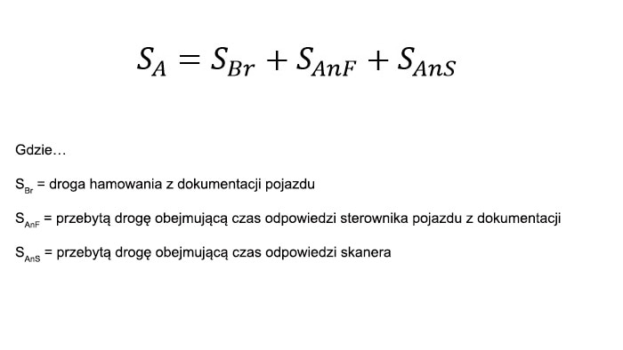 Spośród wszystkich wymienionych wyżej parametrów zazwyczaj największą i najbardziej zmienną wartością w całym łańcuchu jest wartość SA, czyli droga zatrzymania pojazdu. Droga zatrzymania obejmuje drogę hamowania pojazdu, drogę przebytą w czasie odpowiedzi laserowego skanera bezpieczeństwa i czas odpowiedzi sterownika bezpieczeństwa pojazdu.
