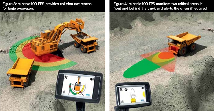 The minesic100 EPS is a collision awareness solution for large excavators (see Figure 3). It provides the excavator operator with warnings to prevent collisions with other vehicles and the highwall face. It also assists the operator with correct vehicle positioning and the safe loading of haul trucks. Obstacles surrounding the excavator are indicated on a display. The operator receives visual and audible warnings in advance to ensure appropriate safety distances are maintained. This ensures that the operator can both manoeuvre the vehicle efficiently and safely, and complete loading operations accurately.