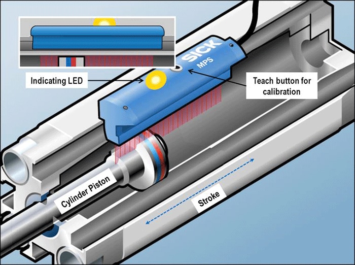 Using MPS in measuring piston linear displace is gaining popularity due to the accuracy, simplicity, robustness and cost effectiveness. Robustness-wise, the MPS involves no moving parts, and therefore not subjected to mechanical wear and tear. Simplicity-wise, the MPS is designed to be mounting on most cylinders directly through the housing slots, thereby obsoleting the mounting brackets. More interesting, the MPS is optimise for cylinder linear measurement, and therefore can be cost effective. Other notable features are that the MPS are rated IP67, which means that it can be used in harsher environment within the electronic industries.