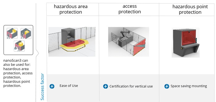 nanoScan3 is the smallest safety laser scanner from SICK. It is perfectly suited for the protection and localization of mobile platforms. Extremely resistant to light, dust or dirt. The easy operation of the Safety Designer configuration software and the smart integration options of the nanoScan3 offer a high level of flexibility for any application while also saving time.