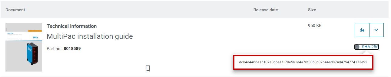- For special use cases technical information can be published on the SICK support portal. In this case the SHA-256 fingerprint is published close to the download link in the support portal.