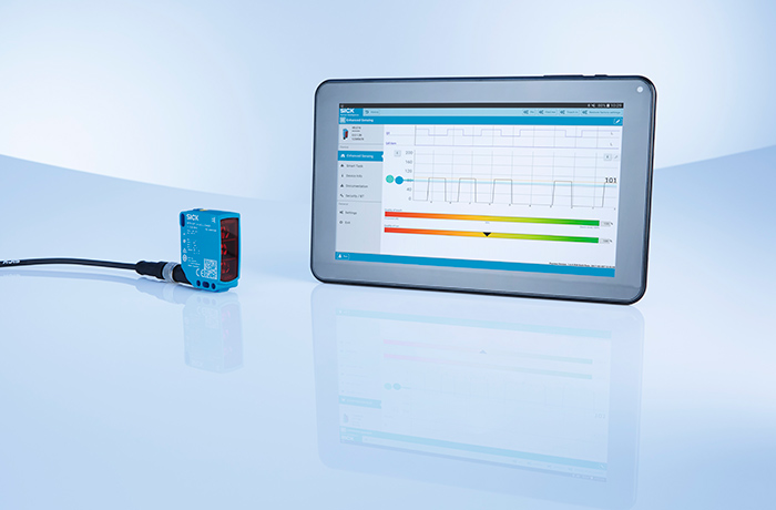 The usability of the new sensor ranges creates a “cockpit feeling” in the machine room. BluePilot, the new blue LED alignment aid enables faster alignment of sensors and reflectors as well as senders and receivers for through-beam and photoelectric retro-reflective sensors. No further setup is required. In live operation, the LEDs also offer a diagnostic function: Should a change in detection quality arise as a result of contamination and/or vibration, the LEDs indicate the degree of impairment by slowly increasing or decreasing the dimming. In this way, the machine operator can detect the fault at a glance early on and thus find a solution before it comes to production failures caused by standstills. Setting up the new photoelectric proximity sensors with BluePilot is just as intuitive a process. To this end, the advantages of the teach-in button and potentiometer have been combined in one operating element. This allows the sensing distance – which is in turn visualized by the blue LED ring – to be configured in a matter of seconds. What’s more, the sensor data is displayed on mobile devices such as tablets or smartphones via a Bluetooth interface so the production staff can keep an eye on the machine status.